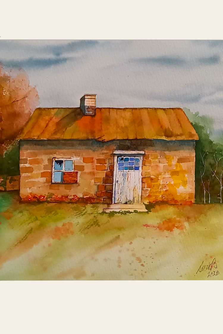 Ett hus som en gång sjöd av liv står nu stilla i tystnad. Spruckna fönster, bleknade väggar och naturen som långsamt tar tillbaka sitt rum. En målning som bär minnet av tidens gång och livets förgänglighet. (Passar tillsammans med Stenhuset i vinter)