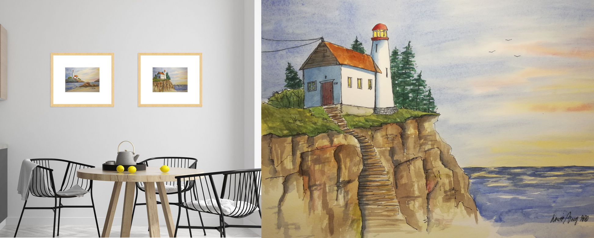 Målningen står starkt på egen hand men är också en del av ett par som tillsammans berättar om havets dramatik och lugn. Passar både ensam och i kombination. Fyr vid viken.