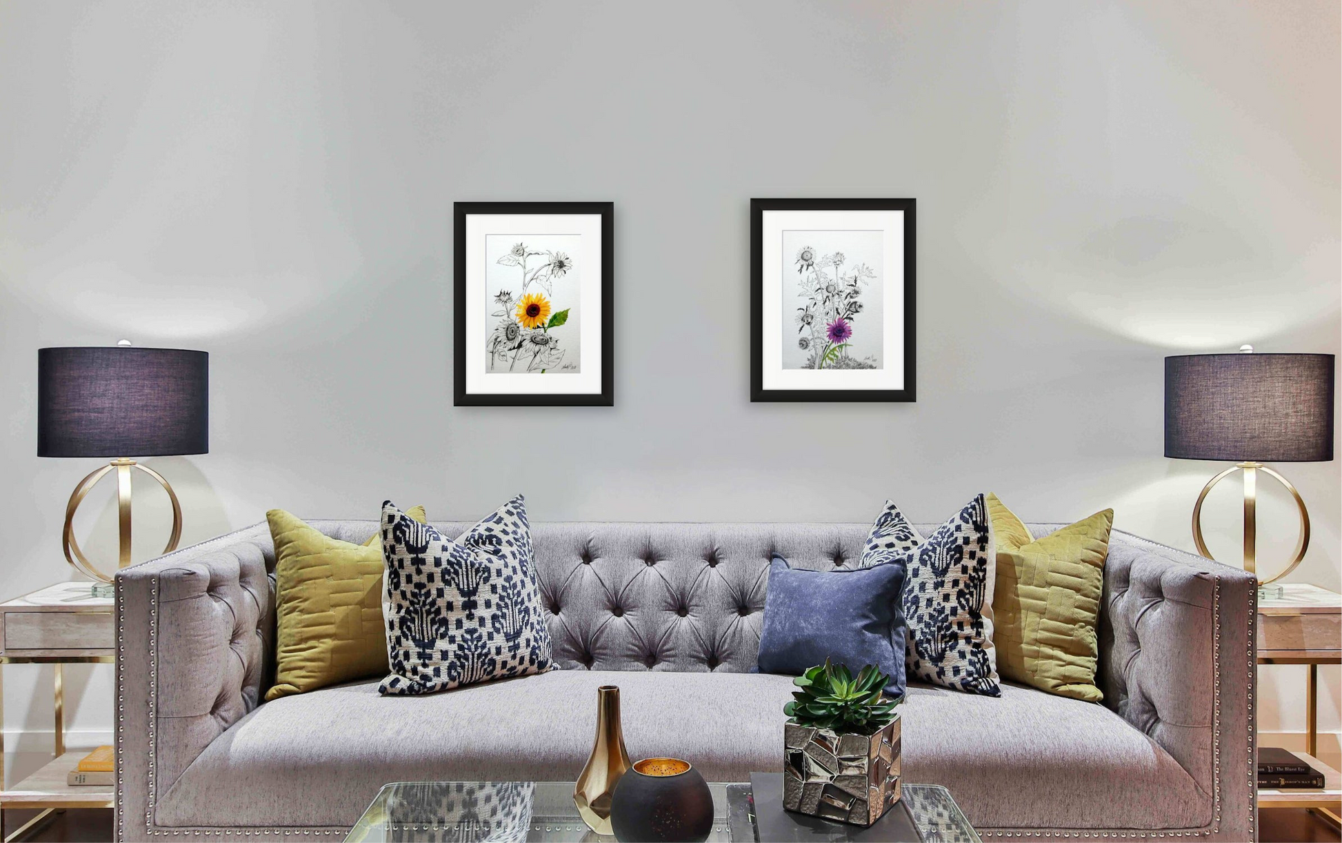 Lila blomma är en akvarellmålning där en färgstark blomma står i centrum mot en grafisk svartvit bakgrund. Ett unikt och modernt motiv som skapar kontrast och elegans. Perfekt för dig som vill ha väggkonst med både enkelhet och färgstyrka.