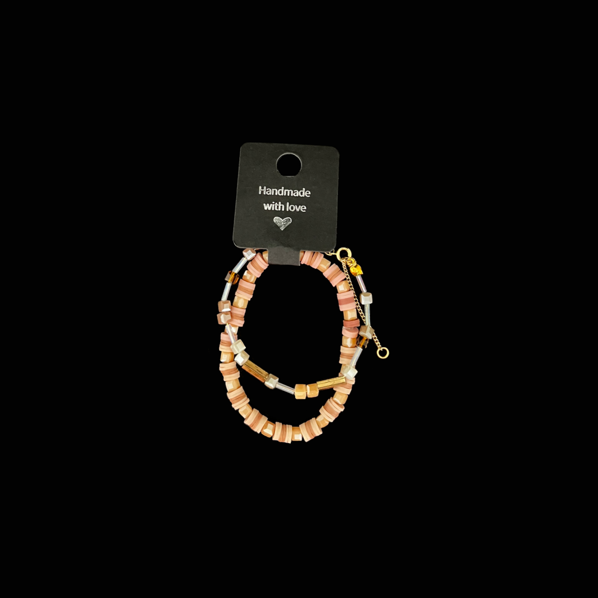 Ett varmt och stilfullt armband i mjuka sand- och rosatoner med guldinslag. Perfekt att bära till vardags eller som en subtil detalj till fest – en smycke som för tankarna till solnedgångar och varma dagar vid havet.