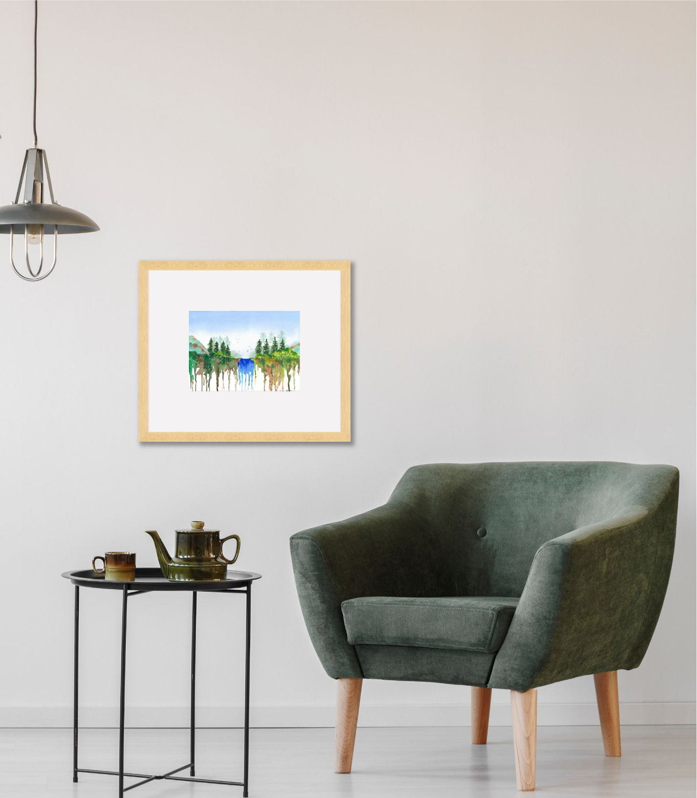 Ett kraftfullt men stillsamt vattenfall rinner fram mellan gröna skogsdungar och möter marken i djupblå toner. Färgerna blandas mjukt och speglar naturens skönhet i ständig rörelse. Målningen är inspirerad av nordisk natur och för dig som vill ta in lugn och friskhet i hemmet.