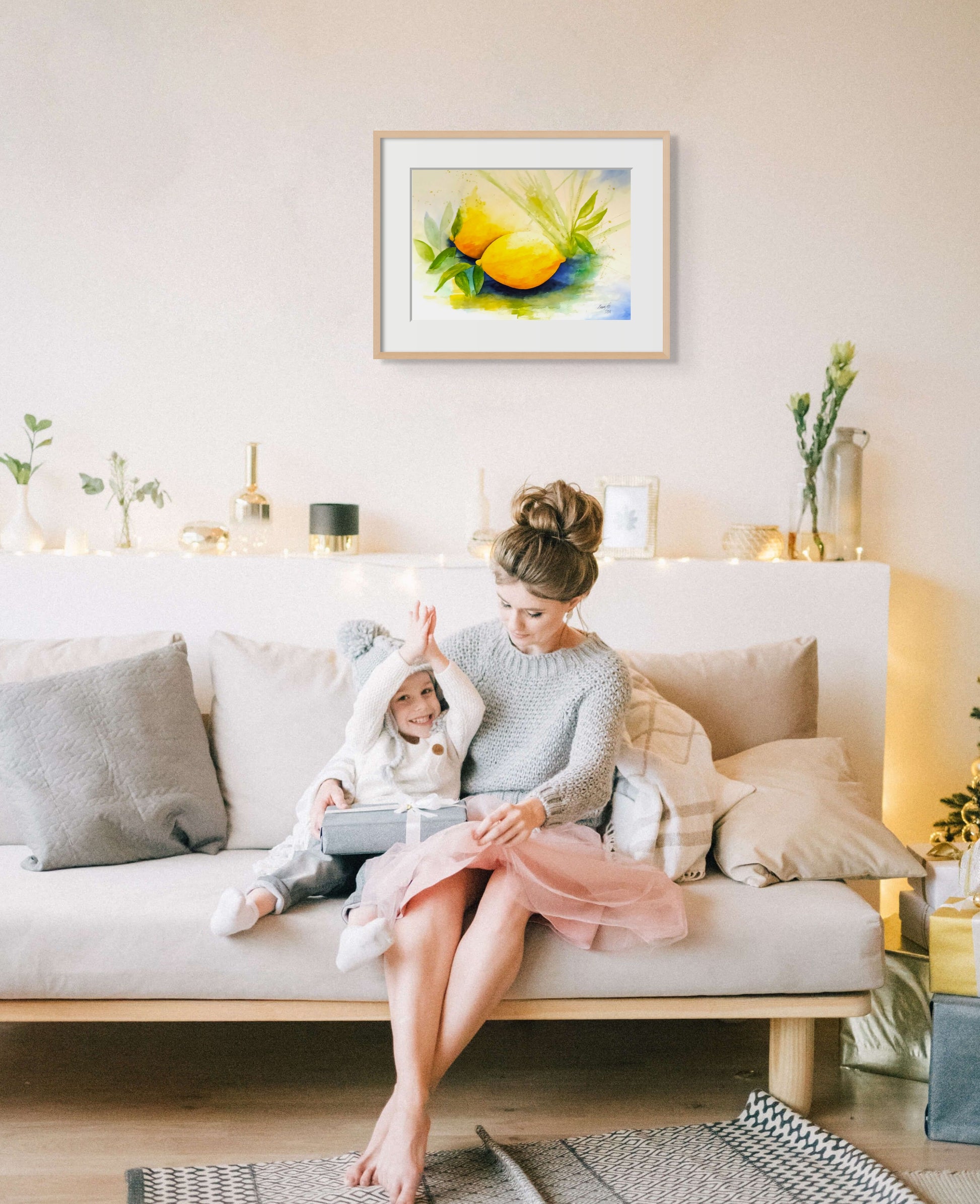 Med sitt friska gula sken sprider dessa citroner en känsla av syrlig friskhet och sommarvärme. Akvarellen fångar naturens enkelhet och livfullhet, där gröna blad möter den klara citronens lyster. En målning som ger energi och ljus till varje rum – perfekt för köket eller matsalen.”